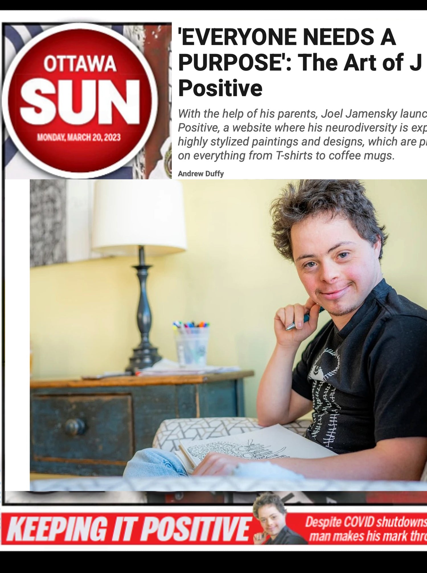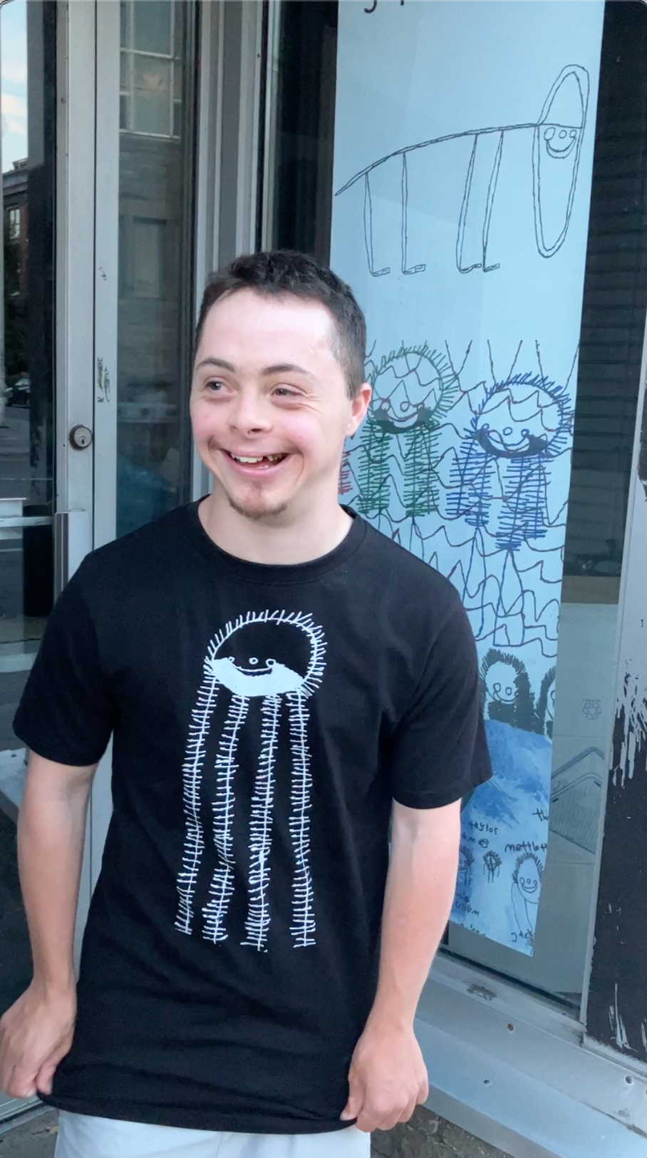 Born in 1995 in Ottawa, Canada, Joel "J Positive" Jamensky was diagnosed with Down syndrome. His parents immediately embraced the unexpected adventure they were about to embark on. Joel has developed his own unique artistic perspective which was encouraged by his Mom from a young age. His art has always brought joy to all who see it. With patience, Joel describes his artwork with the thoughtful titles and descriptions you see in his store. However at other times verbal expression can be challenging for him, but Joel’s art offers a window into his inner world—sharing his feelings and insights that might otherwise go unspoken. Joel participated and exhibited in two local artistic and education groups in Ottawa, BEING and DragonFly, both who have been extremely supportive of Joel’s artistic vision, which continues to evolve.